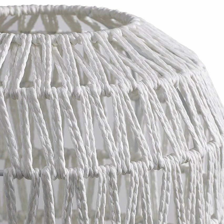 Pied métallique noir et abat-jour en papier imitation rotin blanc.