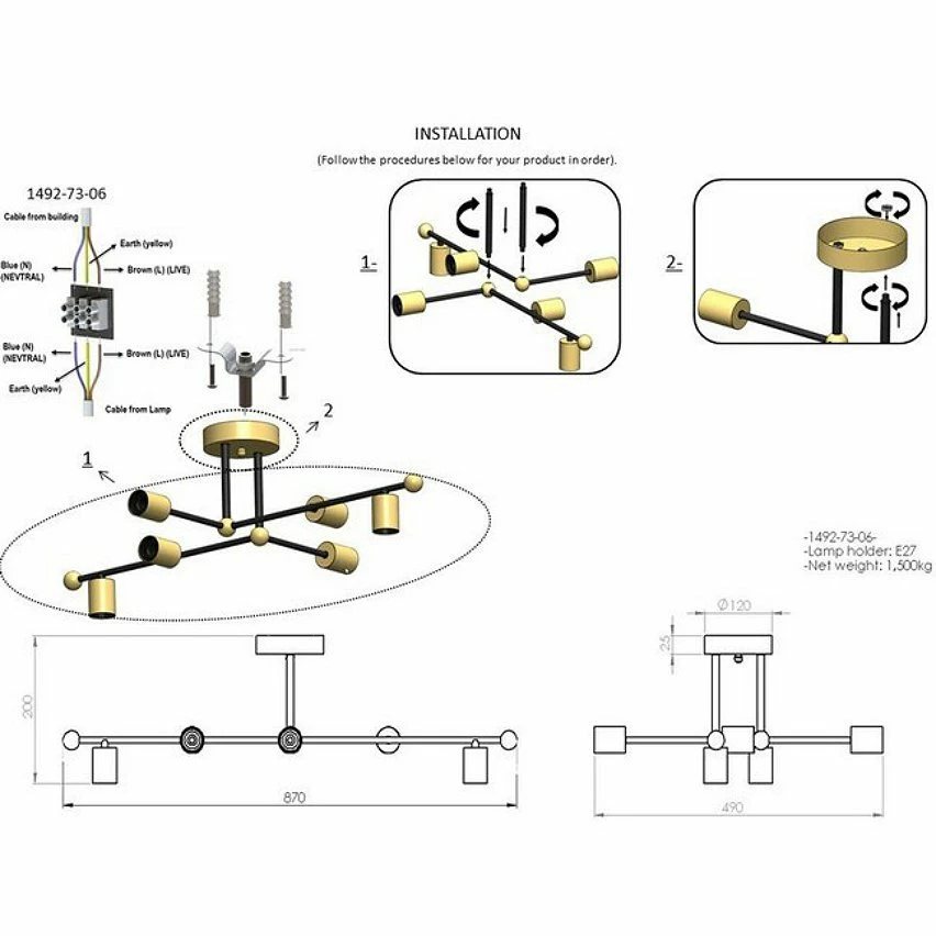 Cette lampe de plafond est la solution parfaite pour illuminer votre maison ou votre bureau avec style. Grâce à sa conception, il est idéal pour le salon et la zone de couchage. Kit de montage inclus, facile à nettoyer, facile à assembler. Couleur: Or, noir | Dimensions: 49x87x20 cm | Matériel: Métal | Puissance: 6 x E27, 40W | Poids du produit: 1,5 Kg | Ampoule: Non incluse| Poids de l’imballage: 1,66 Kg | Nombres de boîtes: 1 | Dimensions de boîtes: 48x28x11 cm