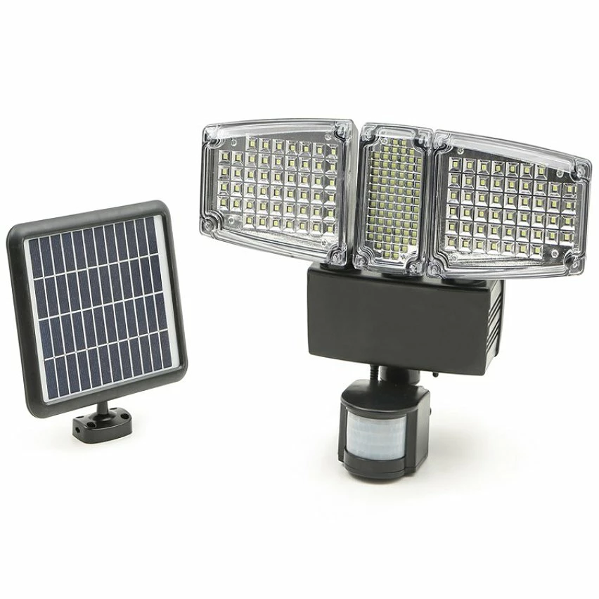 Eclairer de maniĂšre efficace un endroit reculĂ© sans Ă©lectricitĂ© est dĂ©sormais possible grĂące Ă ce projecteur solaire 3 tĂȘtes 178 led avec son capteur solaire dĂ©portĂ© et son dĂ©tecteur de prĂ©sence grand angle.Un abri de jardin, une dĂ©pendance situĂ©e dans le fond du jardin, au-dessus de votre porte de garage : cette lampe d’extĂ©rieur en ABS+polycarbonate est Ă©quipĂ©e de 3 tĂȘtes pour 3 fois plus de possibilitĂ©s !Pratique sans fil, il s’installe oĂč vous le souhaitez avec sa large base et ses 3 tĂȘtes pivotantes de haut en bas et de façon latĂ©rale. Vous Ă©clairez sur une longue portĂ©e oĂč vous le souhaitez. Ce projecteur intelligent s’adapte Ă tous vos besoins.Son dĂ©tecteur de prĂ©sence Ă 180° s’allume au moindre mouvement sur une portĂ©e allant jusqu’Ă 12 m avec une durĂ©e d’Ă©clairage de 3 Ă 7 minutes.3 rĂ©glages disponibles :1er bouton : distance de dĂ©tection : de 2 Ă 12M (ajustable)2e bouton : Temps d’Ă©clairage : de 5 s Ă 5 min (ajustable)3e bouton : intensitĂ© : de 10 Ă 2000 LUX (ajustable)Ecologiques, ses 178 led blanches puissantes sont alimentĂ©es par un panneau solaire dĂ©portĂ© (Dim. 19,6 x 16,1 cm) collectant l’Ă©nergie pendant toute la journĂ©e. Il s’allume automatiquement dĂšs la tombĂ©e de la nuit au moindre passage. Autonomie : 6 Ă 8 h.DĂ©tails du projecteur LED solaire 3 spots 178 LED- Indice de protection IP44 certifiĂ© pour rĂ©sister aux intempĂ©ries- Puissance : 12 W avec batterie solaire en lithium rechargeable : 6V – 1.2W (Batterie 2200 mAh 3.7V 1PK)- Flux lumineux : environ 1200 lumens- Dimensions du projecteur : 28 x 29 x 13 CM en ABS + PC coloris noir- SystĂšme de fixation murale inclus- Conforme aux normes CE / EMC / RoHS en vigueurDĂ©couvrez tous nos projecteurs et appliques sur notre boutique en ligneâ!