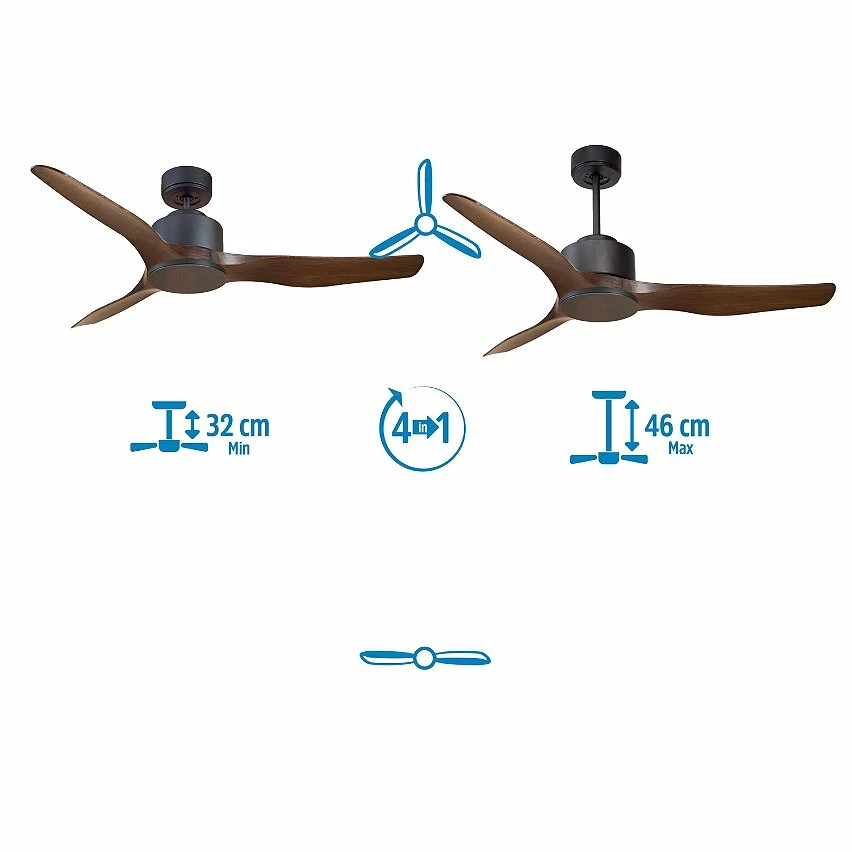 Le moteur à courant continu noir DC1 permet des installations dans les plafonds jusqu’à 27º d’inclinaison et est servi avec deux tiges pour être installé à la hauteur appropriée (13,5 cm et 25 cm). Il est parfait pour 2 ou 3 pales, car il dispose d’une fonction auto équilibrée. Il prend également en charge le kit de lumière. Ce modèle est réversible, de sorte qu’en hiver, vous pouvez inverser ses pales pour que son mouvement déplace l’air chaud vers le bas, agissant en complément de votre système de chauffage et favorisant une consommation optimisée. Il comprend également un thermostat à sa base, de sorte que vous pouvez le programmer pour que le ventilateur fonctionne en fonction de la température ambiante.