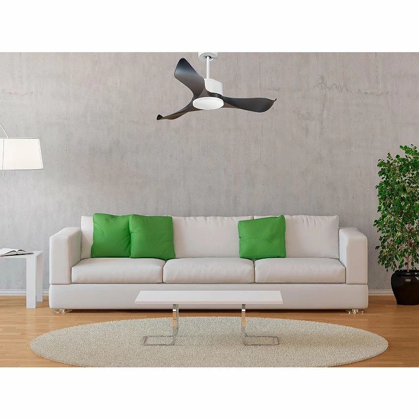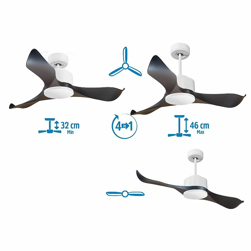 Le moteur Ă courant continu blanc DC4 permet des installations dans les plafonds jusqu’Ă 27Âș d’inclinaison et est servi avec deux tiges pour ĂȘtre installĂ© Ă la hauteur appropriĂ©e (13,5 cm et 25 cm). Il est parfait pour 2 ou 3 pales, car il dispose d’une fonction auto Ă©quilibrĂ©e. Il prend Ă©galement en charge le kit de lumiĂšre. Ce modĂšle est rĂ©versible, dĂ©sestratificateur d’air, de sorte qu’en hiver, vous pouvez inverser ses pales pour que son mouvement dĂ©place l’air chaud vers le bas, agissant en complĂ©ment de votre systĂšme de chauffage et favorisant une consommation optimisĂ©e. Il comprend Ă©galement un thermostat Ă sa base, de sorte que vous pouvez le programmer pour que le ventilateur fonctionne en fonction de la tempĂ©rature ambiante.