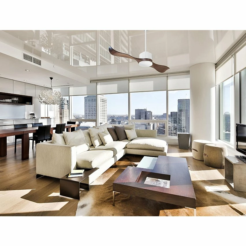 Le moteur à courant continu blanc DC4 permet des installations dans les plafonds jusqu’à 27º d’inclinaison et est servi avec deux tiges pour être installé à la hauteur appropriée (13,5 cm et 25 cm). Il est parfait pour 2 ou 3 pales, car il dispose d’une fonction auto équilibrée. Il prend également en charge le kit de lumière. Ce modèle est réversible, désestratificateur d’air, de sorte qu’en hiver, vous pouvez inverser ses pales pour que son mouvement déplace l’air chaud vers le bas, agissant en complément de votre système de chauffage et favorisant une consommation optimisée. Il comprend également un thermostat à sa base, de sorte que vous pouvez le programmer pour que le ventilateur fonctionne en fonction de la température ambiante.