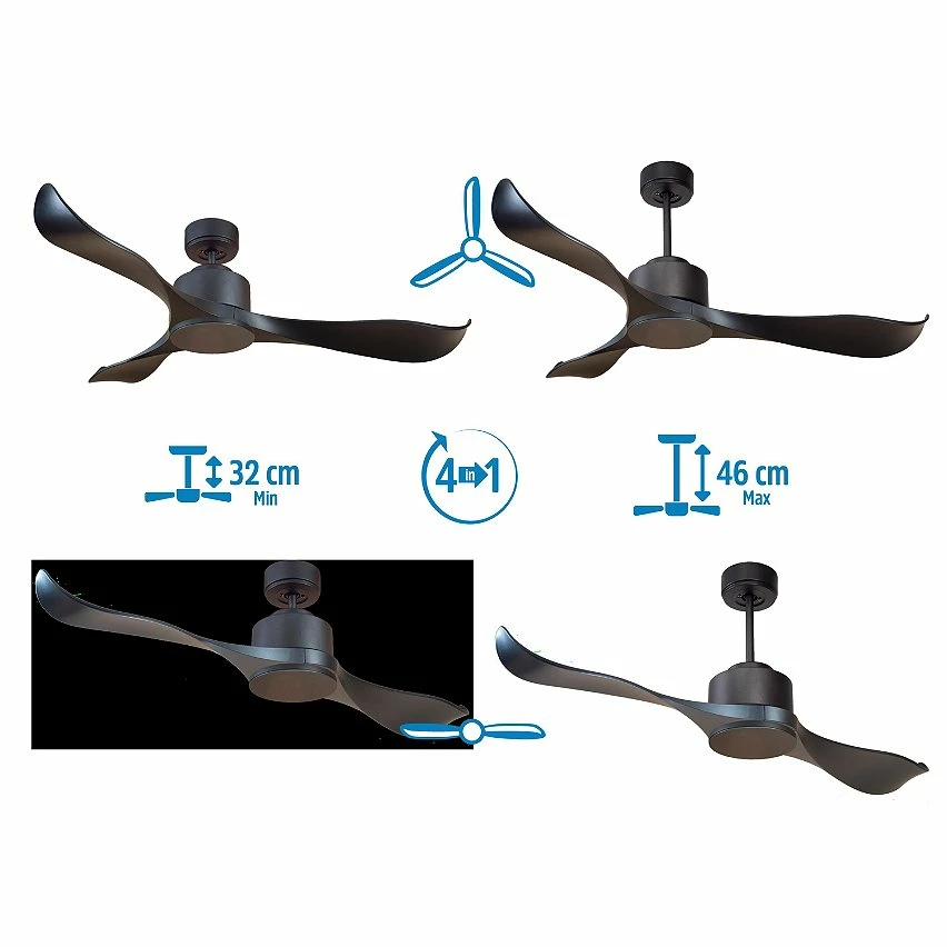 Le moteur Ă courant continu noir DC1 permet des installations dans les plafonds jusqu’Ă 27Âș d’inclinaison et est servi avec deux tiges pour ĂȘtre installĂ© Ă la hauteur appropriĂ©e (13,5 cm et 25 cm). Il est parfait pour 2 ou 3 pales, car il dispose d’une fonction auto Ă©quilibrĂ©e. Il prend Ă©galement en charge le kit de lumiĂšre. Ce modĂšle est rĂ©versible, dĂ©sestratificateur d’air, de sorte qu’en hiver, vous pouvez inverser ses pales pour que son mouvement dĂ©place l’air chaud vers le bas, agissant en complĂ©ment de votre systĂšme de chauffage et favorisant une consommation optimisĂ©e. Il comprend Ă©galement un thermostat Ă sa base, de sorte que vous pouvez le programmer pour que le ventilateur fonctionne en fonction de la tempĂ©rature ambiante.