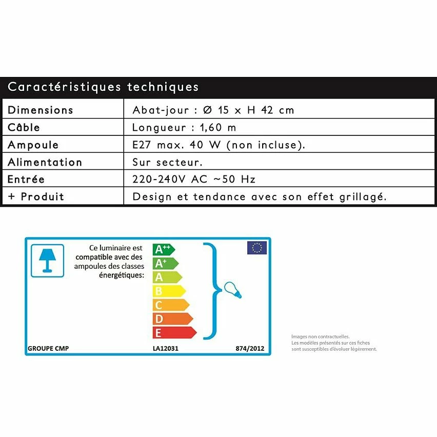 Ampoule : E27 max 40W (non fournie)